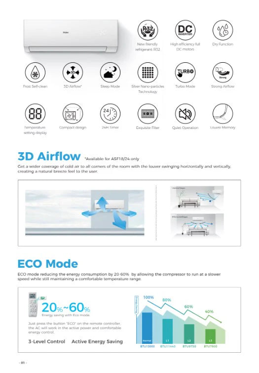 ECO mode reducing the energy consumption by 20-60% by allowing the compressor to run at a slower. speed while still maintaining a comfortable temperature range.