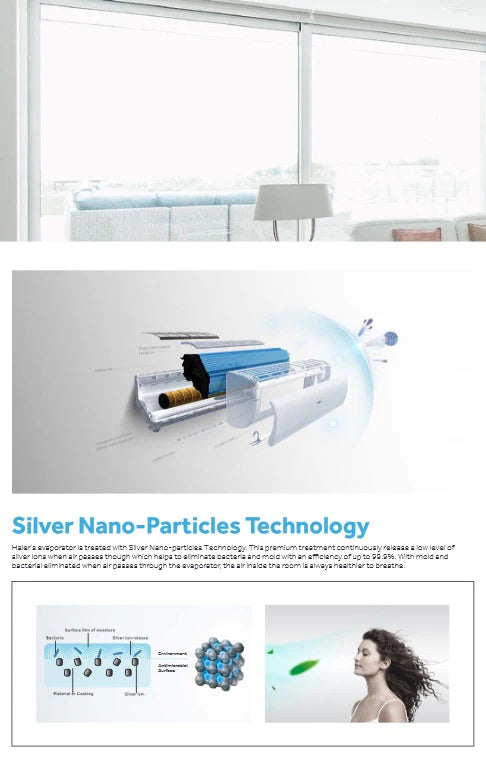 Haier's evaporator is treated with Silver Nano-particles Technology. This premium treatment continuously releases a low level of silver ions when air passes through which helps to eliminate bacteria and mold with an efficiency of up to 99.9%.