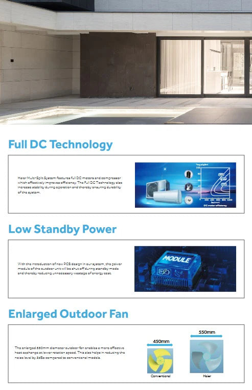 Haier Multi-Split System features full DC motors and compressor which effectively improves efficiency. The Full DC Technology also increase stability during operation and thereby ensuring durability of the system.