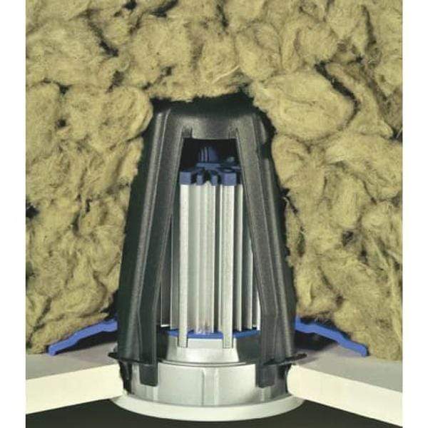 The HellermannTyton SpotClip-II series of light covers has been developed to prevent any contact between insulation materials and recessed down lights. These light covers can even be installed afterwards, opening up a variety of applications in both new and old buildings. The SpotClip-II can be used in ceiling cavities with diameters from 62mm to 90mm, with a maximum height of 107mm. The light cover ensures that a safe distance is kept between the downlight, insulation foil and roof insulation, reducing the risk of overheating and heat build-up.