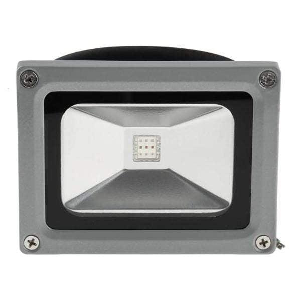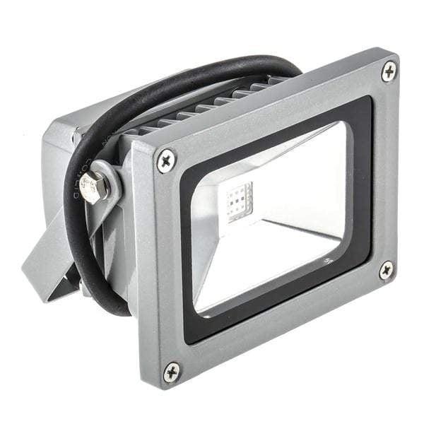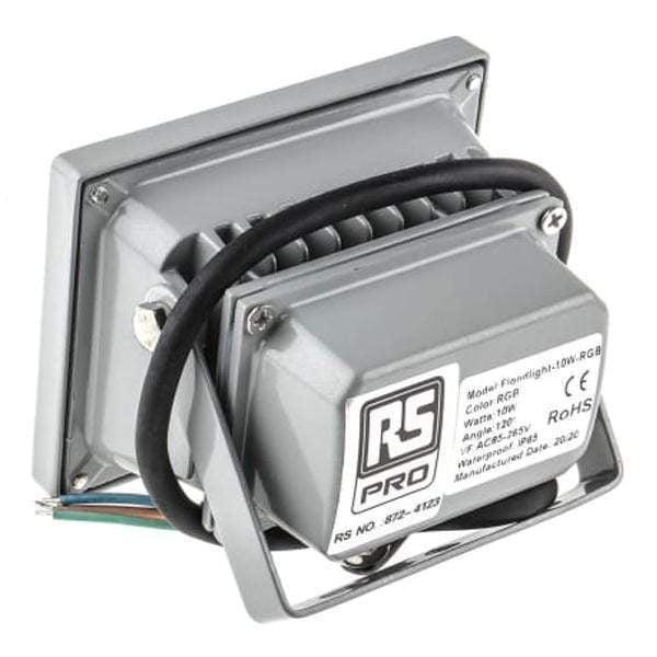 RS LED floodlight featuring an RGB chip and supplied with a remote control. The remote control can be used to switch the floodlight on and off as well as play or pause lighting effects. The remote also allows the output colour of the RGB LED to be adjusted with pre-set colours via short-cut colour buttons including white. The remote also provides dimming controls and the following effects: jump, stroboscopic, gradual and smooth colour change