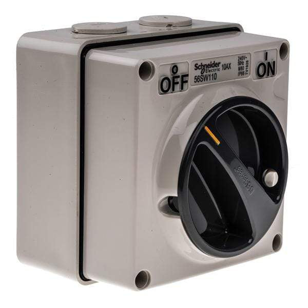1 gang 1 way rotary switch suitable for normal and reactive loads eg. fluorescent lamps. Rotating switches give clear indication of status. Padlockable in OFF position.