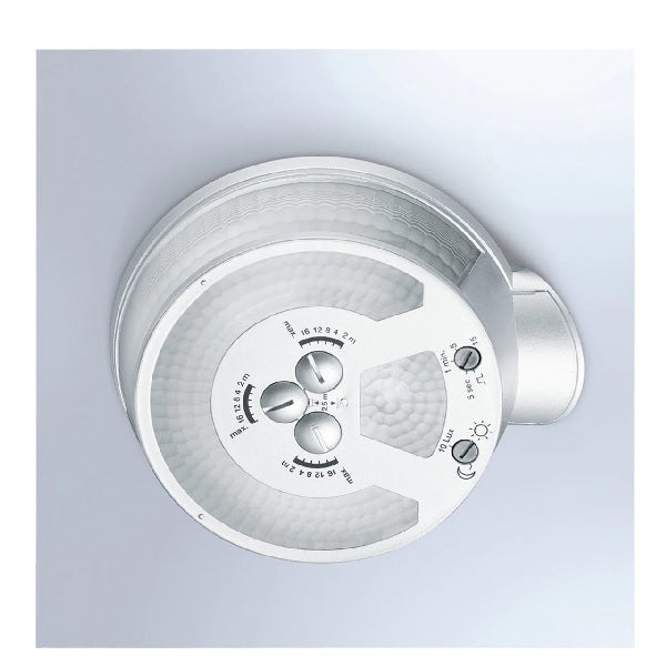 PIR (Passive Infrared) Motion Detector. The revolutionary sensIQ for indoors and out, ideal for building entrances, loading bays, installation height up to 5 m, quadruple sensor system for optimum coverage over a 300° detection angle, 20 m range (tangential), metre-precision reach setting in 3 different directions, heavy-duty relay for high switching capacity.