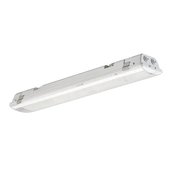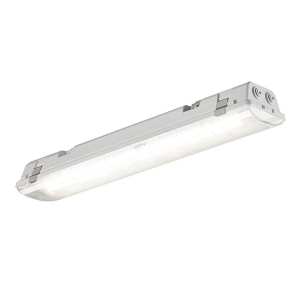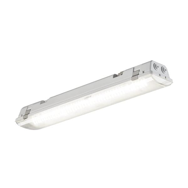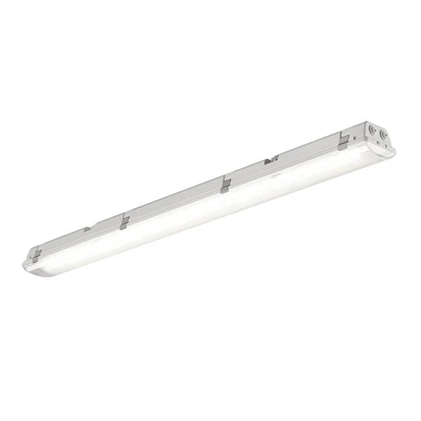 Start Waterproof, integrated LED weatherproof luminaire, with UV stabilized flat diffuser and linear prisms designed to achieve uniform lit appearance, optimise light output and to reduce glare, stainless steel diffuser clips and fixing brackets for surface mounting. Polycarbonate housing, Polycarbonate diffuser, 4800 lm, 38 W, 127 lm/W, 4000 K, drive current 1050 mA, Non dimmable, nominal average life (h):50000, 1278 mm x 110 mm x 78 mm, energy class: A++ A+ A, D-mark