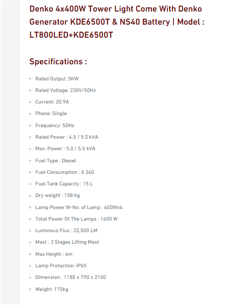 Denko 4x400W Tower Light Come With Denko Generator KDE6500T & NS40 Battery | Model : LT800LED+KDE6500T