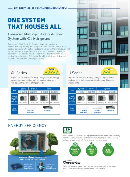 Panasonic's Multi-Split Air Conditioning System with the environmentally friendly R32 refrigerant offers flexible multi-zone cooling solutions with just one outdoor unit, perfect for installation with limited outdoor spaces. Connects up to 4 rooms with independent operational control and a vast selection of indoor types from a wide cooling capacity range. Enjoy a comfortable and cleaner living space with our customizable multi-split system.